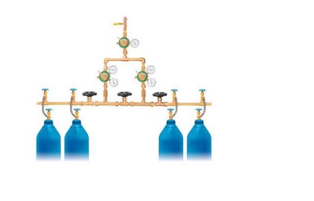 中心供氧系統(tǒng)匯流排的組成部分有兩種,一根是左匯流主管道,另一根是右匯流主管道,中間有四只高壓閥門,分別控制左右兩組匯流管,每組有相當(dāng)數(shù)量的分閥,軟管及卡具連接氣瓶,中間裝有一塊高壓表,用來檢測匯流管內(nèi)的壓力,高壓閥門上方分別有兩組減壓器,以便控制調(diào)節(jié)使用壓力及流量。